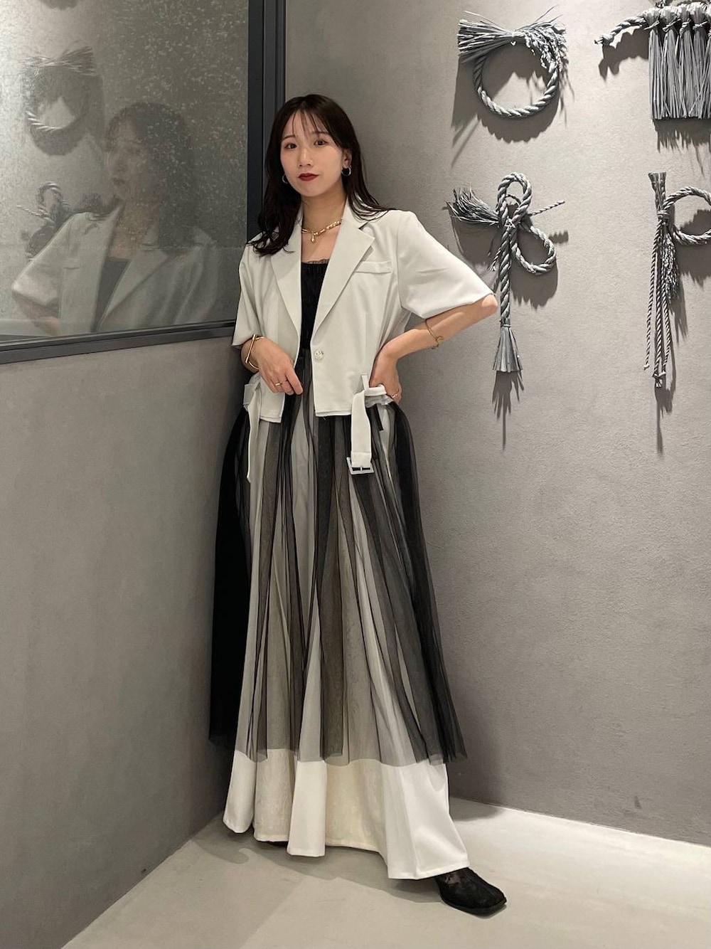 153cm/骨格ウェーブ ■ジャケット カットオフデザインのショートジャケット! 肘まで隠れる袖で二の腕カバーできます◎ ベルトできゅっとしめるのもおすすめ✨ ■チュールスカート スカートにもワンピにもなるアイテム👌🏻 ペチコート付きなのでとても便利です✨ 広がりすぎないチュールで体型カバーにも◎