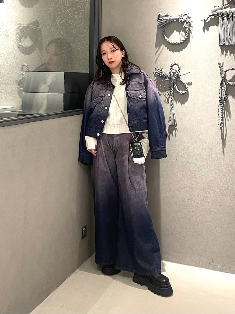 153cm/骨格ウェーブ ■デニムセットアップ グラデーションデザインのデニムセットアップ! ジャケットはフリーサイズ パンツはS/Mサイズ展開です! 私の身長(153cm)で 足首が少し見える丈→Sサイズ 足首隠れる丈→Mサイズ これではSサイズ着用! ずるずるではないのでスニーカーでも◎