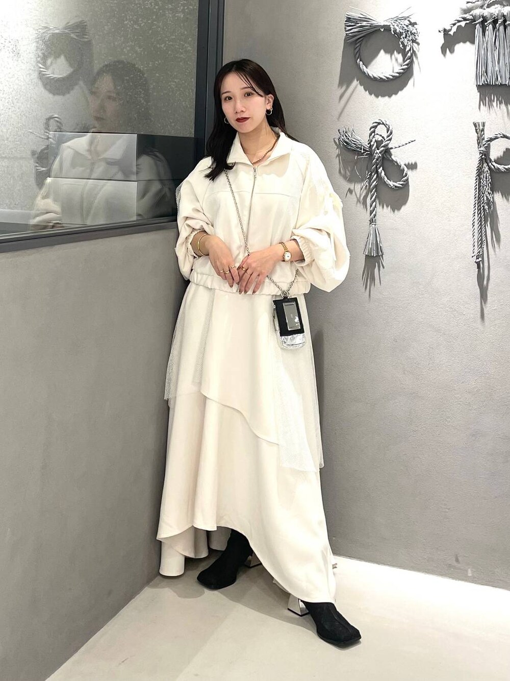 153cm/骨格ウェーブ ■セットアップ メッシュデザインのセットアップ! 丈感的に、低身長さんにもおすすめ◎ ブルゾンはとても軽くてラフに着やすい! デニムに合わせるのも個人的おすすめです✨ スカートは前が短めの丈です! ブーツ、ソックス見せができます🫶🏻 後ろゴムで楽ちんです〜〜