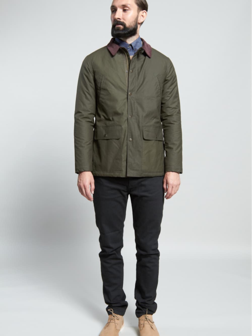 Vanishing Elephant macintosh style jacket has a regular fit, features front button and zip fastening, contrast corduroy collar, long sleeves with button fastening at cuffs, diagonal welt pocket on front, front patch pocket with buttoned flap, tab fastening at neckline, water resistant