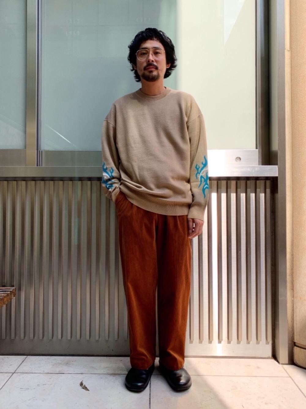 最近ハマっているブラウントーンの組み合わせ。ディテールの色を拾い、足元はブラックレザーをもってくることでで全体を引き締めました。