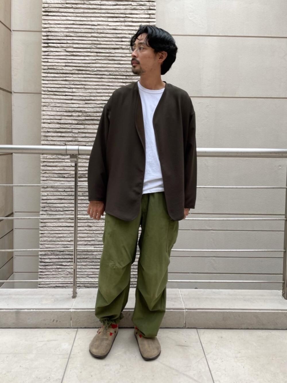 UA&SONS by D.Oシリーズのカーディガンを主役に組み立てたコーディネートてす。ポリエステル素材のトップスは、上下同素材で合わせても良いですが、コットン素材のパンツで合わせることて、素材のコントラストが生まれ、トップスの存在感を引き立てます。