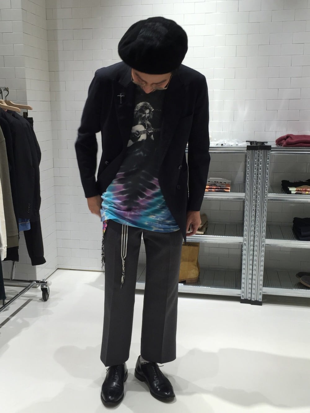 Jacket: S/DOUBLE × UNITED ARROWS & SONS Tee: USED Pants: VINTAGE Shoes: Allen Edmonds お気に入りの S/DOUBLE × UNITED ARROWS & SONSコラボの スーツ組上を中心に組み立てました。 ネイビー×グレーの王道の合わせに 今プチマイブームのベレー帽 春夏を意識してタイダイのBig Tee合わせました。 更にベルトはグアテマラで購入した手織りの物。 スーツスタイルにエスニックやベレー帽といった 組み合わせで新たなスタイル提案を。