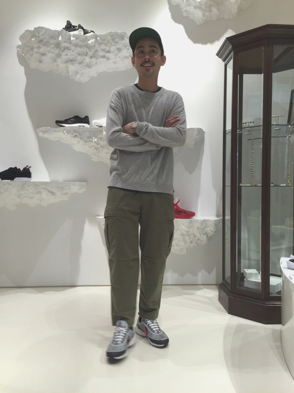 Cap : T.C.S.T. Knit & Pants : UNITED ARROWS & SONS Shoes : NIKE ありそうでない、オーバーサイズのカシミアニット そしてテーパードの効いた綺麗なシルエットの6ポケットのミリタリーパンツ。 共に&sonsのオリジナルです。 着心地、履き心地抜群に良いです。