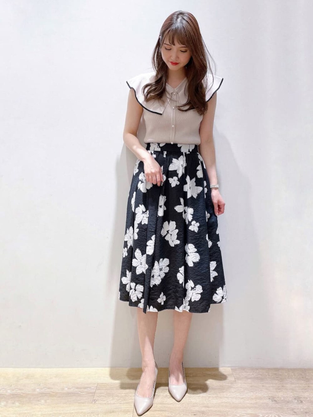 mizuki 160cm 上品な華やぎをプラスしてくれるニットに 花柄のフレアスカートでフェミニンスタイルに🫧 柔らかな色合いのトップスなので、ボトムのカラーは 落ち着いたブラックベースがおすすめです🙆♀️