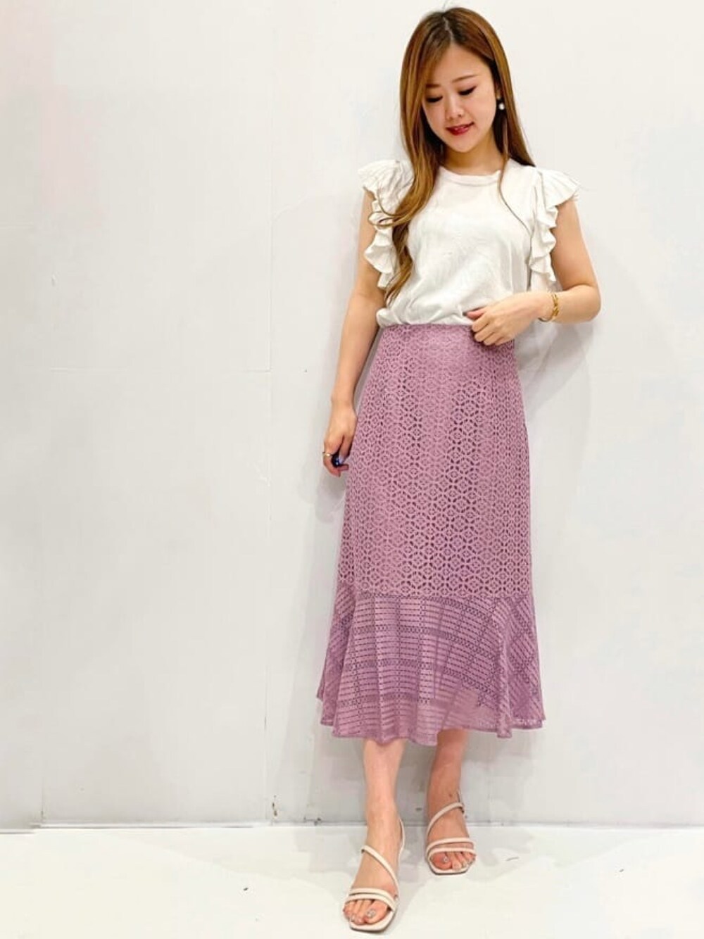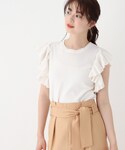 RENA 154cm 甘めな女性らしいスタイリング。トップスのフリルが大きめで可愛らしい印象になります! 袖口の横の空きが広いので、中はキャミソールをおすすめ🙆♀️