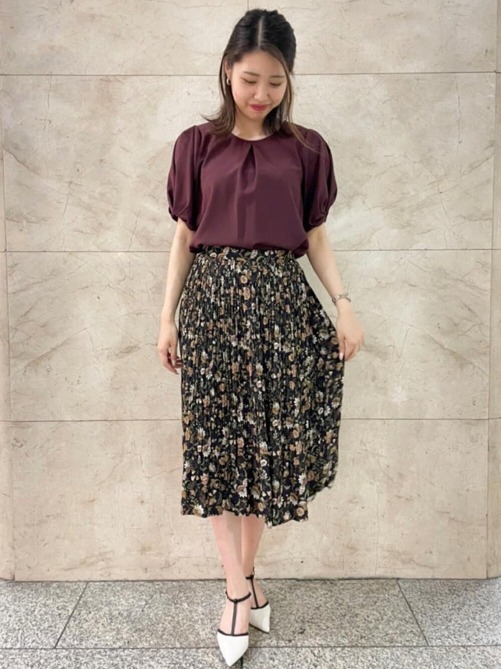 このか 165cm シアーストライプのブラウスは、お袖がふんわりとしている5分袖で、二の腕もしっかりカバーしてくれます🙌🏻 お仕事で着用して頂くのはもちろん、柄物のスカートなどで、デイリーでも着用して頂けます☺️ プリーツスカートは、ファスナーなしで、後ろがゴムになっているのでとても履きやすいです✨