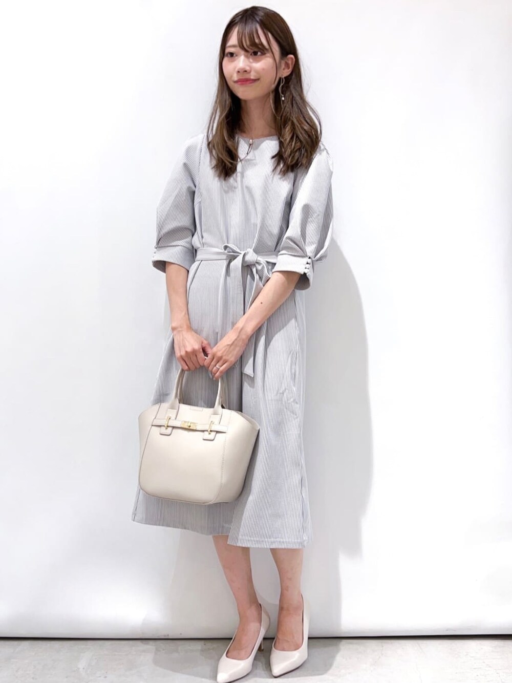 Hina 160cm ワンピースは凹凸感のあるサッカー素材なのでさらっと着用できます! パールがついているのでアクセサリーなしでも華やかに🤍