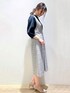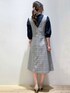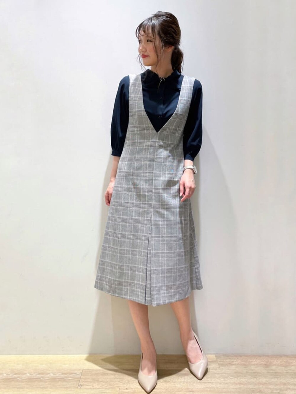 mizuki 160cm グレンチェック柄のジャンパースカートを使ったコーディネート! チョウタイの甘めデザインブラウスはネイビーカラーをチョイスで、さりげない甘さが大人っぽく◎ 肘が隠れる着丈も嬉しいポイントです✨