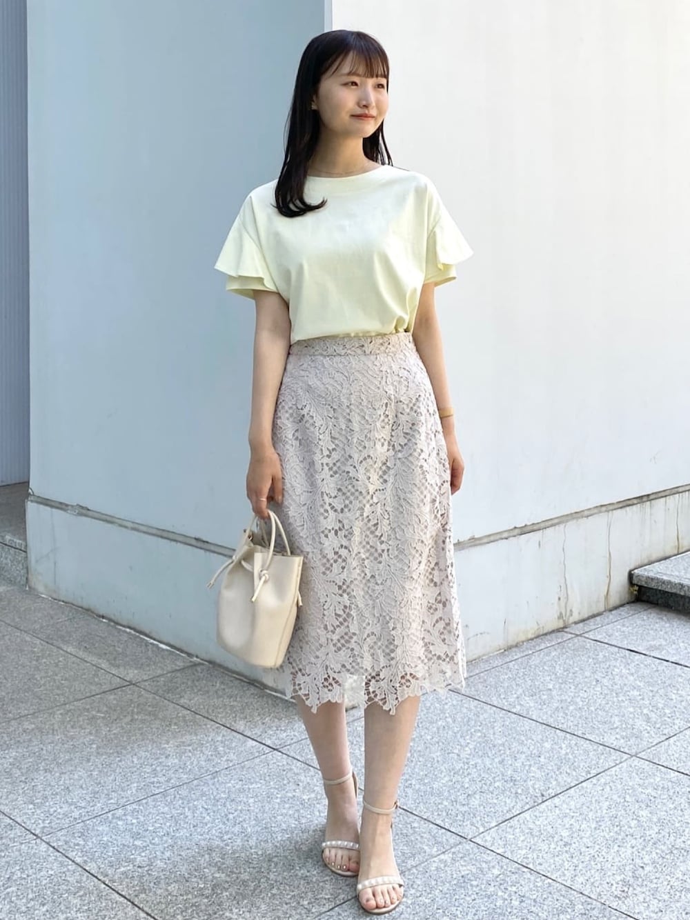 みさか 158cm トップスは袖のダブルフリルデザインがポイント♪ 気になる二の腕周りをカバーしてくれるので、世代を問わず着用いただけます。接触冷感・UVケア・洗濯機OKの夏に嬉しい機能付きです。 着用しているレモンイエロー(031)カラーは、イエベ春の私の肌にぴったり◎ 158cm Mサイズの着用でジャストサイズ。バストラインや二の腕周りなど気になる方はLサイズがおすすめ。 スカートはオフィスコーデ定番のレースデザイン。 シンプルなのでどんなトップスとも相性抜群です! 細身 Mサイズの着用でウエストがゆるめ。華奢な方はSサイズがおすすめ。