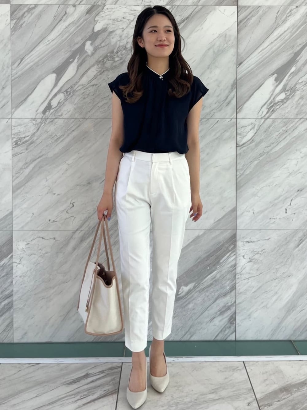 oota 165cm シックなカラーのオフィスコーデ。 首元のボタンとパイピングがポイントのネイビーブラウス。 フレンチスリーブなので、腕がすっきり見えするのが嬉しいポイント! 165cm普通体型の私でMサイズが少しゆとりがあって丁度良かったです♪ 合わせた白のパンツは伸縮性があり履き心地◎ 王道のテーパードパンツなので着回し力も抜群です! Lサイズと迷いますが、ダボっせずスッキリ履きたかったのでMがジャストサイズでピッタリでした!