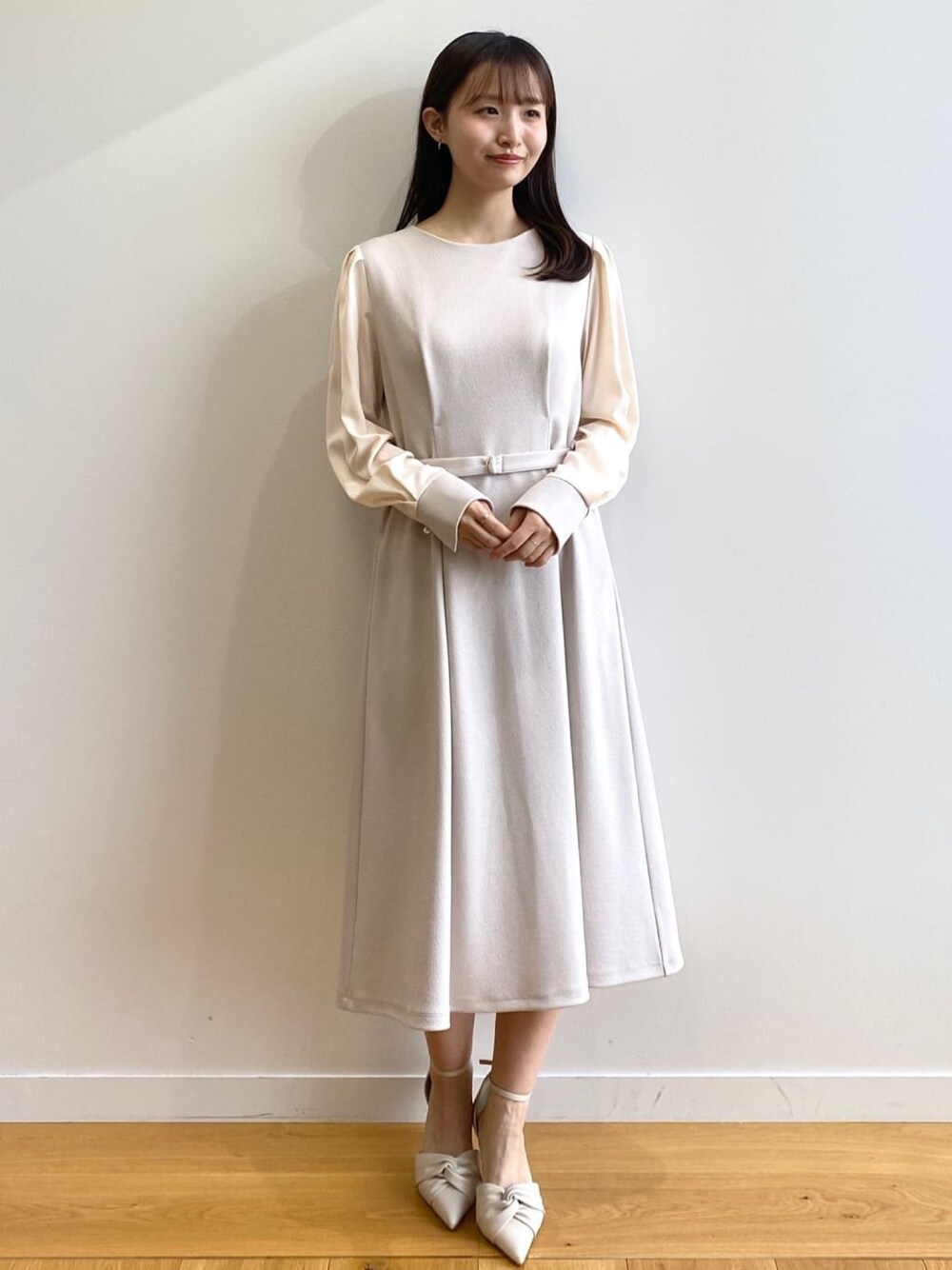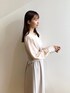 みさか 158cm 【サイズ感】 ・ワンピースはMサイズ着用。普段気になるバストラインはキツくなく、安心感があります。スネにかかる着丈です。 【素材感・着心地】 ・ワンピースは伸縮性のあるジャージ素材です♪程よい肉感があります。本体部分にのみ裏地がついており、同系色のインナーを合わせれば透ける心配もありません。 【おすすめポイント】 ・ワンピースは袖がやや透け感があり、上品ぽさもあります◎袖にはパール調ボタンが付いており、高見えします♪ 【スタイリングポイント】 お呼ばれにぴったりなワンピーススタイル。入学式や顔合わせ、通勤着にもぴったりです。イエベの私は肌馴染みがよく雰囲気も良く見え、顔まわりもくすんで見えません。