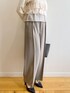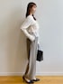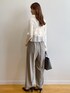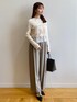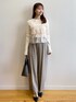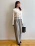 みさか 158cm 【サイズ感】 ・ニットはMサイズ着用。腰にかかる着丈なのでタイトなボトムスにもインができます◎袖はやや長めです。 ・パンツはMサイズ着用。細身体型でウエストはやや緩めです。くるぶしが隠れる着丈なので、高さのあるシューズと合わせると、よりバランス良く見えます。 【素材感・着心地】 ・ニットはサラッとした着心地で、伸縮性もあります。毛玉になりにくいです。 ・パンツは落ち感のある素材です。防シワの機能付きなので座っても安心! 【おすすめポイント】 ・ニットはたっぷりなフリルがポイント。一枚で着映えます。 ・パンツはワイドなシルエットで足のラインを拾いません。骨格ウェーブ特有の張って見える太もも周りも気になりません。 【スタイリングポイント】 フリルがポイントのきれいめカジュアルなコーディネート。甘くなりすぎないように、バッグとシューズは黒い色をチョイスしました。