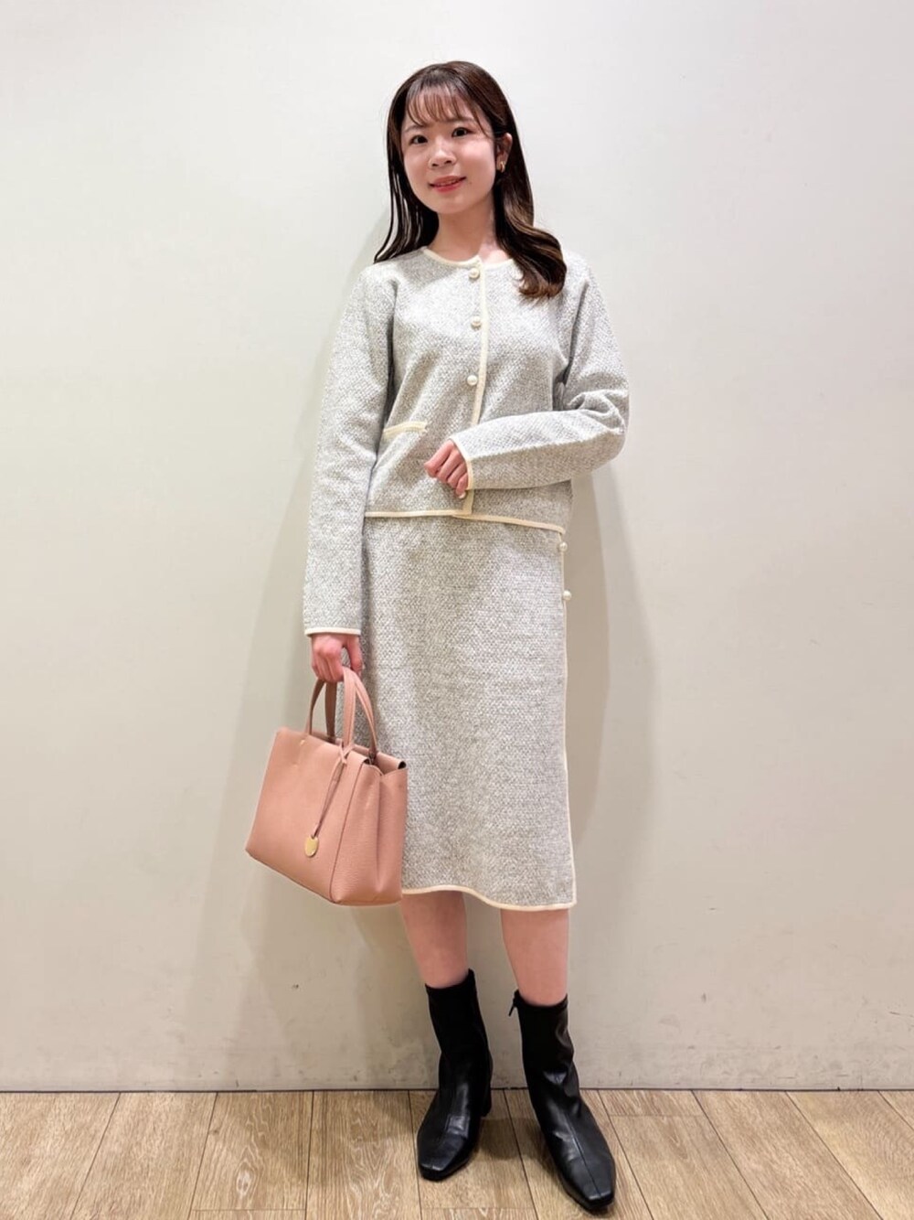 aya 157cm 【サイズ感】 カーディガン:Mサイズ着用/程よいサイズ感でした。 スカート:Mサイズ着用/157cmで膝下くらいの丈感でした。ブーツと合わせるとバランスよく合わせて頂けます。 【素材感・着心地】 カーディガン:スカートと共にツイードのようなニット素材で、柔らかく伸縮性のある着心地です! スカート:ウエストは総ゴムなので締め付け感なく着用頂けます。 【おすすめポイント】 カーディガン:しっかりとした素材なので一枚のプルオーバーとしてはもちろん、ワンピースやブラウスの羽織りとしても活躍する一枚です! スカート:大きなパールボタンがポイントになり女性らしい印象に♪ 【スタイリングのポイント】 トレンド感のあるツイードセットアップコーデ♪ 通勤やお出掛け、セレモニーシーンまで幅広く活躍します♪