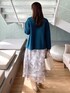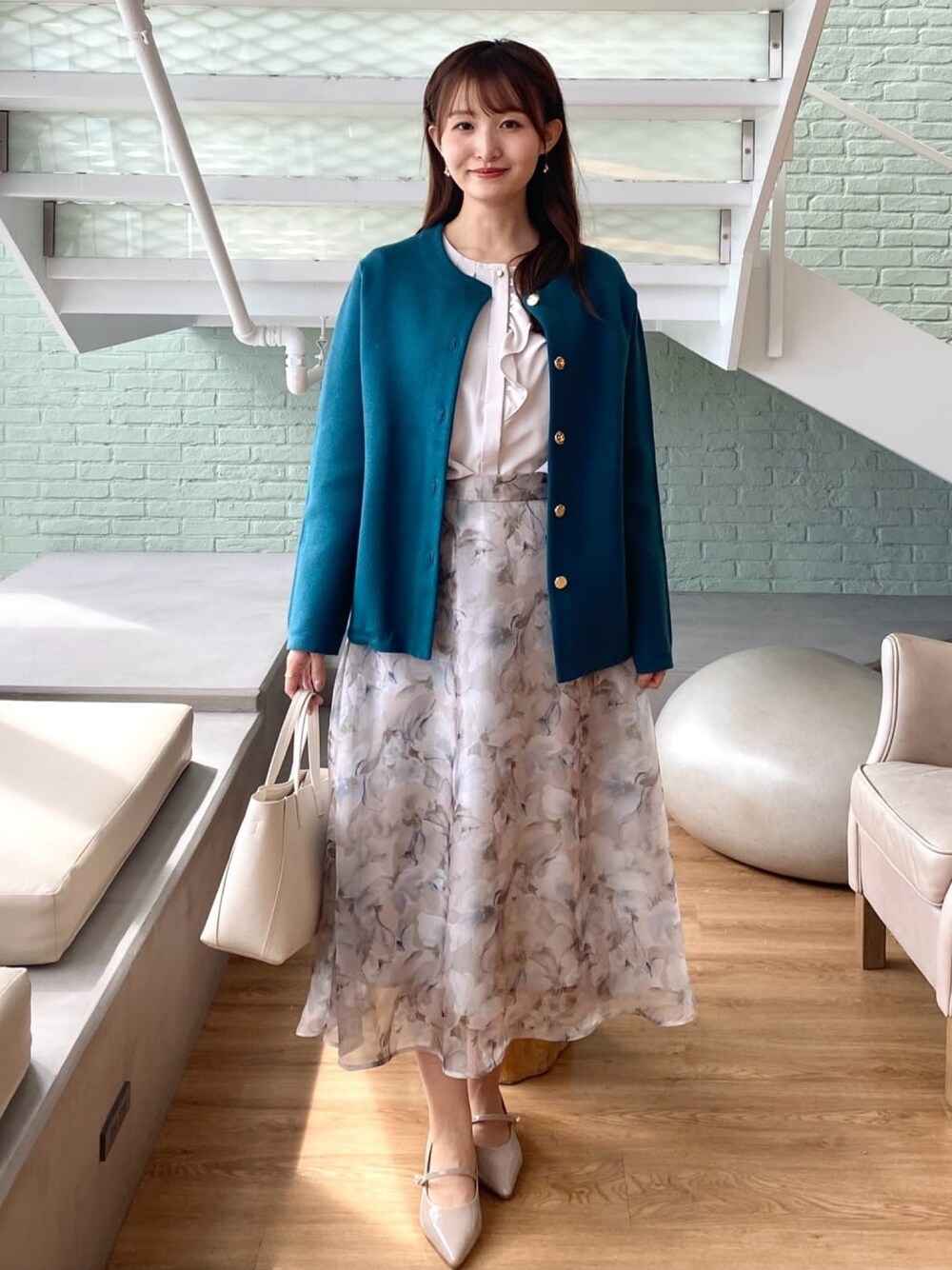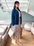 みさか 158cm 【サイズ感】 ・コーディガンはフリーサイズ着用。袖が長め。ヒップラインにかかる着丈です。 ・ブラウスはMサイズ着用。袖がやや長めです。身幅があるので、全体的にゆとりがあります。 ・スカートはMサイズ着用。細身体型なのでウエストはやや緩め。スネにかかる着丈です。 【素材感・着心地】 ・コーディガンは柔らかく、ハリ感があります。厚みのある素材感です。 ・ブラウスはとろみのある素材感で高見えします。 ・スカートはシアー感のある軽い素材感です◎ 【おすすめポイント】 ・コーディガンは、アウターのように羽織ることができます。金ボタンで高見えします。通勤時の羽織としてもおすすめ◎ ・ブラウスは胸元のフリルデザインがポイント。顔周りが華やぎます。 ・スカートは上品な花柄がフェミニンな印象です♪デートからお仕事にも着用できます。 【スタイリングポイント】 ブルーグリーンのコーディガンがポイントのフェミニンコーディネート。コーディガンが主役になるように、バッグやシューズも淡い色で揃えました!