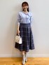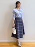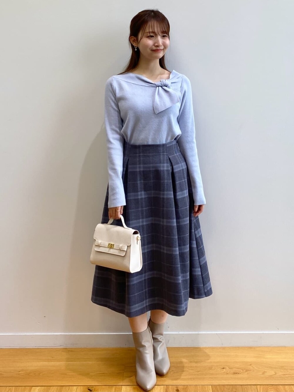 みさか 158cm 【サイズ感】 ・ニットはMサイズ着用。本体部分はジャストサイズ。腕が短めなので袖がやや長く感じます。 ・スカートはMサイズ着用。細身体型なのでウエストはやや緩めです。スネが隠れる安心丈です◎ 【素材感・着心地】 ・ニットは伸縮性があり着心地快適です。チクチクさは気になりません。 ・スカートは厚みがあり、柔らかな素材。裏地もあり冬でも安心してご着用頂けます! 【おすすめポイント】 ・ニットはリボンのようなアシメボウタイデザインがポイント!デコルテが見え、顔周りがすっきり。女性らしい印象です。 ・スカートはチェック柄が冬らしい印象。タックシルエットが綺麗に広がります。 【スタイリングポイント】 冬のオフィスコーディネート。ブルーのワントーンでまとめました!優しい色味なので、イエベさんにも合います◎