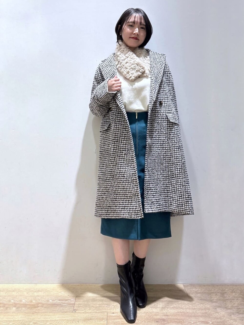 【サイズ感】 160cm/骨格ナチュラル コートはMサイズ着用で 程よくゆとりがあります。 【素材感・着心地】 コートはミニブークレ素材で ややふくらみのある生地です! ハンドウォッシャブル機能付きで ご自宅でお手入れ可能です! 【オススメポイント】 コートはラグランスリーブなので、 少し肉厚なニットの上からでも 羽織りやすいです! 【スタイリングポイント】 カラースカートにも 千鳥柄のチェスターコートは相性◎です! ティペットファーを合わせて お出かけスタイリングにまとめました!