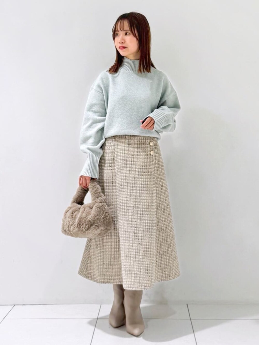 【サイズ感】 ・ニット 148cmの身長でMでゆとりのあるサイズ感です。 【素材感・着心地】 ・ニット チクチク感なく、優しい肌ざわり。 ラメ混が華やかな印象に仕上がります◎ 【おすすめポイント】 ニットはリラクシーに着て頂けるのでカフェ巡りや女子会などにもおすすめです(^^) 【スタイリングポイント】 ライトグリーンで明るい雰囲気に。 小物もベージュで統一すると柔らかく 大人可愛さを演出してみました。