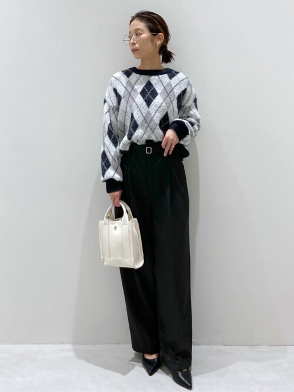 えり 156cm 【サイズ感】 ニット:FREEサイズ着用ジャストサイズ。着丈はヒップがでます。 ワイドパンツ:Mサイズ着用ウエスト余裕があります。丈は気持ち長め。フロントホックタイプ、後ろゴム仕様なのでジャストサイズはSサイズ。 【着心地.素材感】 ニット:フェザー糸で編まれたフワフワ素材で、つい触りたくなる肌心地の良い一枚です。 ワイドパンツ:肌触りが良く、吸湿発熱加工が施されており暖かく穿いて頂けます。ストレッチも効いてます。 マシンウォッシャブル対応、イージーアイロンなのでお家でのメンテナンスが楽です。 【おすすめポイント】 ニット:裾はリブの切り替えでタックアップバランスがし易いです。 ワイドパンツ:ハイウエストデザインがスタイルアップ効果が狙えます、 【スタイリングポイント】 アーガイル柄をアクセントにモノトーンスタイリング。