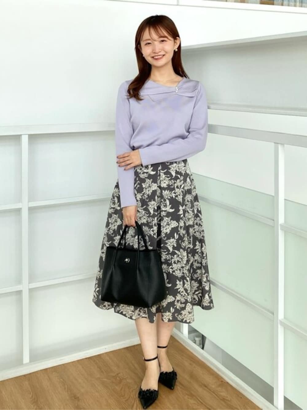 みさか 158cm 【サイズ感】 ・ニットはMサイズ着用。腕が短めなので袖丈がすこし長く感じます。腰にかかる着丈なので、タイトめのボトムスにもインがしやすいです。 ・スカートはMサイズ着用。スネにかかる着丈で安心です。ウエストはニットをインするとジャストサイズです! 【素材感・着心地】 ・ニットは伸縮性があり着心地快適です。自宅の洗濯機で洗えます◎ ・スカートはポリエステル素材なので丈夫で軽いです。サラッとした肌触りなので春先まで着用できます。 【おすすめポイント】 ・ニットはリボンデザインとパール調ボタンがポイント。顔周りが一気に華やぎます。 ・スカートはウエストのバイカラーパイピングと上品な花柄がポイント!お仕事からデートまで幅広くご着用いただけます。 【スタイリングポイント】 カラーニットがポイントのきれいめコーディネート。小物はブラックカラーで合わせて、落ち着いた印象に仕上げました。