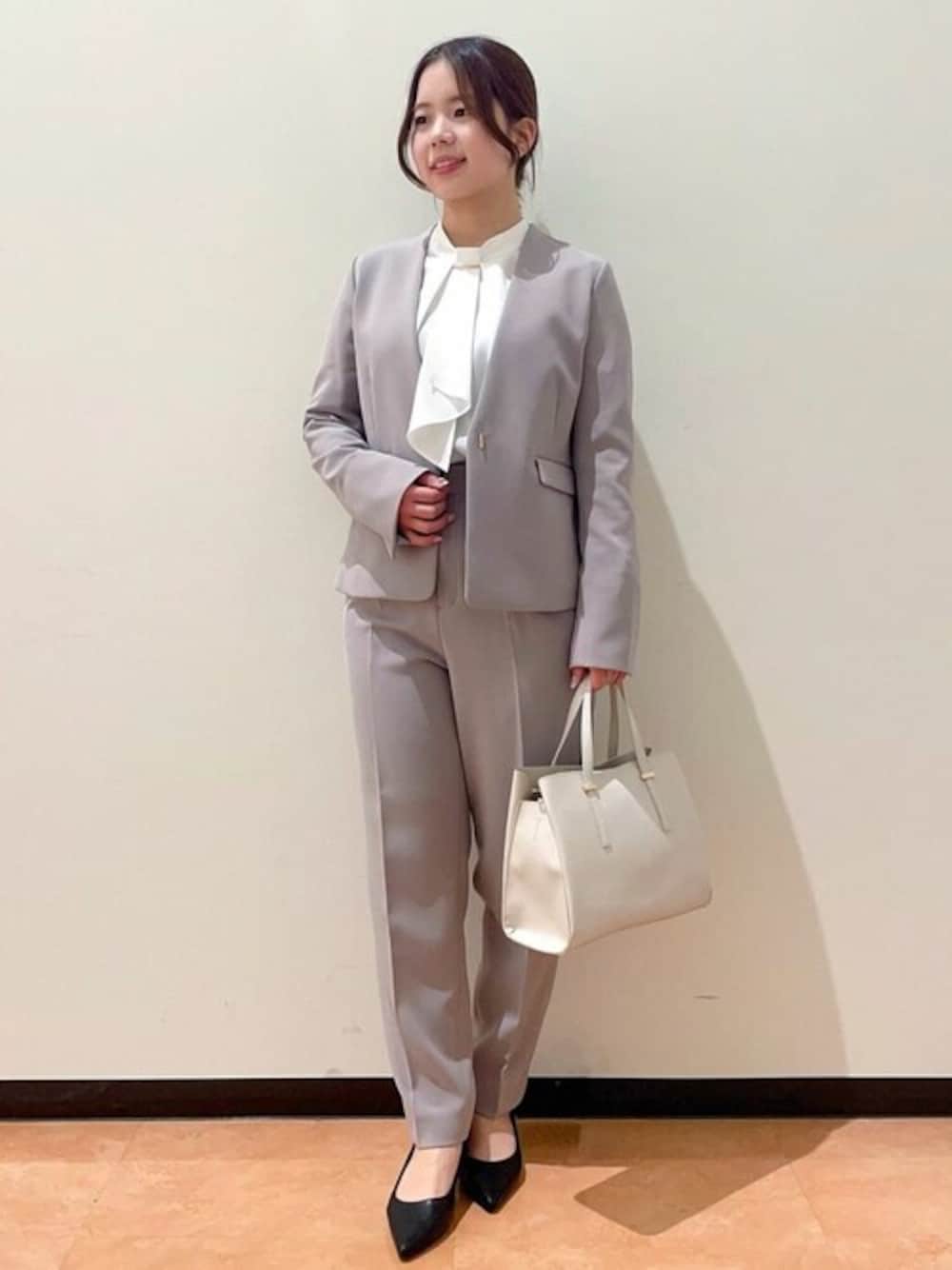 ayumi 150cm 【サイズ感】 ジャケットSサイズ着用で肩周り細身でした。 着丈はちょうど良かったです。 パンツSサイズ着用で、ウエストぴったりでした。丈は足首かかる長さです。 ブラウスMサイズ着用でややゆとりあるくらいでちょうど良いサイズ感でした。 【素材感・着心地】 ジャケットとパンツはセットアップで、ストレッチ素材で動きやすく着心地抜群です。 シワになりにくく、マシンウォッシャブルも可能でお手入れ簡単です◎ 【おすすめポイント】 入学式、卒業式などのセレモニースタイルに活躍できるセットアップ。 きれいめオフィスコーデからオフィスカジュアル幅広く活躍できます。 【スタイリングポイント】 グレージュカラーで春らしく垢抜けた印象になるセットアップコーデにしました♪