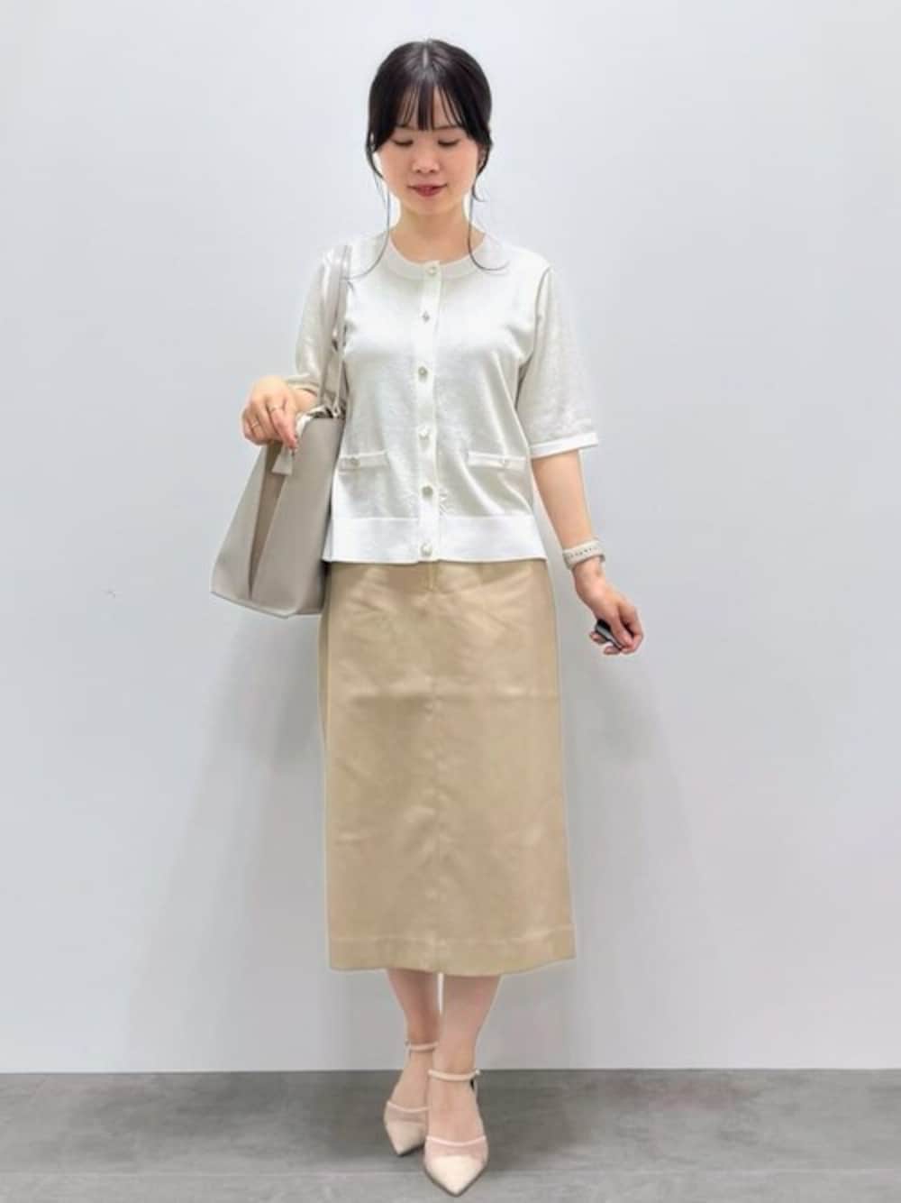 kozu 148cm 【サイズ感】 ・カーディガン Mで程よくゆとりのあるサイズ感です! 絶妙な丈感で148cmでもバランスが取りやすい◎ ・スカート ミディ丈のタイトシルエット。 長すぎずスッキリ見えします◎ 【素材感・着心地】 ・カーディガン サラッとした肌触りで柔らかいニット素材。 UVケア機能が嬉しいポイントです。 ・スカート 滑らかで少し伸縮性あり。動きやすい。 【おすすめポイント】 ・カーディガン パール釦付きでアクセサリー要らずの 華やかさが1枚で様になります◎ ・ベージュ×ホワイトの柔らかいトーンが上品見え。 【スタイリングポイント】 インせずとも決まるカーディガンの短丈が、 小柄さんに嬉しいデザイン。 通勤コーデにもおすすめです!
