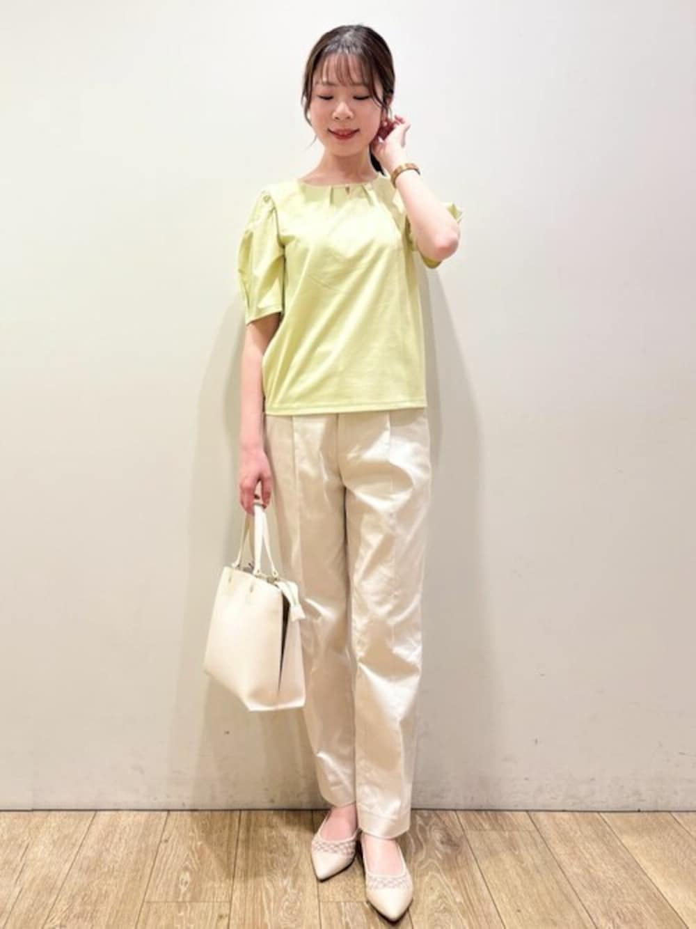 aya 157cm 【サイズ感】 トップス:Mサイズ着用/ちょうどいいサイズ感でした。 パンツ:Mサイズ着用/ラインを拾いすぎずちょうどいいサイズ感でした。 【素材感・着心地】 トップス:ひんやりとした接触冷感が付いているので暑い日でも涼しげに着用頂けます。 さらっとした素材なので肌当たりも良いです◎ パンツ:ストレッチの効いた穿き心地なので動きやすくフィット感があります。 【おすすめポイント】 トップス:首元のパール調デザイン華やかな印象にまとまります。 ジャケットやカーディガン合わせもポイントになりおすすめです♪ パンツ:シルエットが綺麗なテーパードパンツなのでスタイルアップ見えします。 【スタイリングのポイント】 カラートップスが際立つよう他のアイテムを淡い色でまとめました!