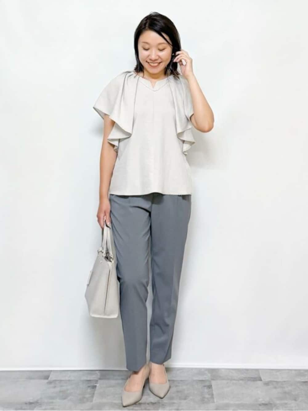 yuka.a 159cm 【サイズ感】 トップス:Mサイズ着用 ゆとりがあり窮屈感なく着用できました。 腰回りをカバーしてくれる着丈で、ボトムからアウトにしてもバランス良くまとまりました。 お袖も二の腕をカバーしてくれる長さがあります^ ^ パンツ:Mサイズ着用 脚まわりにゆとりをもって穿けるサイズ感でした。 テーパードシルエットですっきりとしており、美脚見えも叶います^ ^ 【素材感・着心地】 トップス:麻素材のように見えますが、シャリ感のあるポリエステルでお作りしているので、シワになりにくくお洗濯も簡単な嬉しいアイテムです^ ^! 吸水速乾機能付きで、暑くなる時期にもサラリと快適な着心地です。 パンツ:薄手でさらりと着用でき、シャリ感があるので涼やかな印象です。 マシンウォッシャブル対応と接触冷感機能もついているので、暑い時期にも気軽に着られるのも嬉しいポイントです^ ^ 【おすすめポイント】 トップス:フリルが華やかで、内側に入るようなデザインになっているので華奢見えしました^ ^ ネックレスのようなチェーンモチーフは取り外し可能になっています。 パンツ:快適に着用でき、お手入れもしやすいのでデイリーユースにぴったりなパンツです。 バッグポケットの位置やセンタープレスなど、シンプルに見えて細部をこだわってお作りしているので、スタイルアップ効果も◎です^ ^ 【コーディネートのポイント】 華やかなフリルブラウスはインせず体型カバー力を活かしたスタイルに^ ^ テーパードシルエットのパンツでよりスッキリとした印象にコーディネートしました。