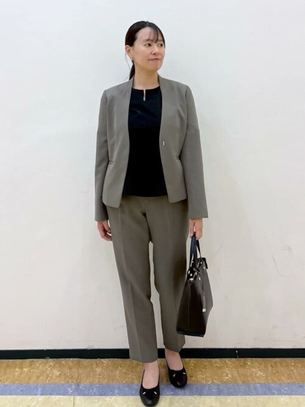 akari 164cm 【サイズ感】 164㎝ 骨格ナチュラル 全てLサイズ着用です。 ■ジャケット 肩幅が気になる体型なのでLサイズ着用しております。袖周りはゆとりがあり薄手のバルーンスリーブのトップスを着ても問題なく着用できるサイズ感です。 着丈は腰にかかるくらいです。 ■パンツ 164㎝でくるぶしくらいの着丈です。ウエスト後ろがゴム仕様なので楽に穿いていただけるサイズ感です。 【着心地】 ■ジャケット 滑らかでとても着心地の良い素材です。きちんと見えしますが着苦しさはなく動きやすさもあります。 ■パンツ ジャケットと同素材でストレッチ性もあり動きやすいのでお仕事にも◎身体のラインも拾いすぎず安心感もあります。 【おすすめポイント】 きちんと見えも時短も叶うセットアップはお仕事におすすめ。それぞれ単品使いもしやすいベーシックデザインなので着回し力もあります。 【スタイリングポイント】 女性らしさもあるトープカラーのセットアップに他はブラックで合わせたきちんと見えスタイリング。トップスをインするのが苦手な方はこちらのインナー合わせがおすすめです。