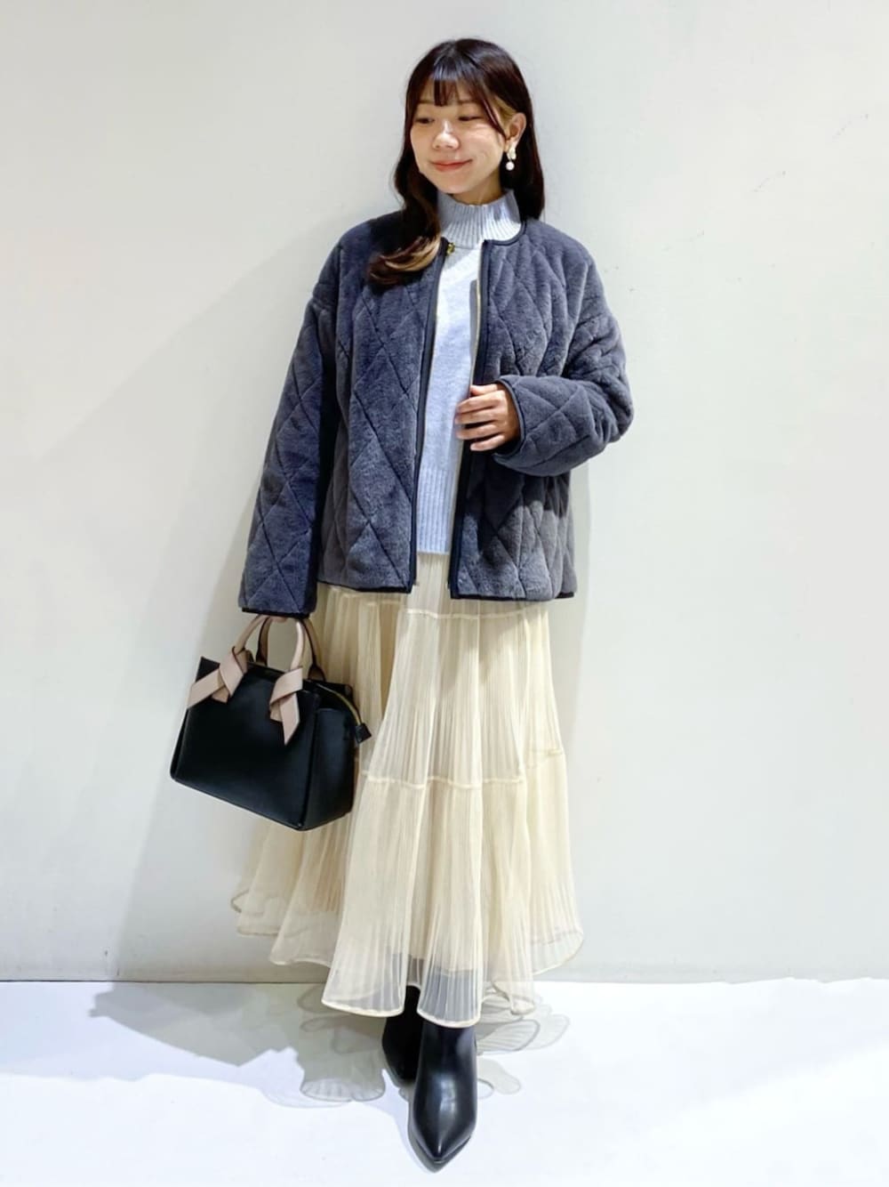 ちぃ 147cm 【サイズ】 アウター…Mサイズ しっかりゆとりあり厚手のニットとの相性も◎ 丈は長過ぎず低身長さんでもバランス取りやすい長さです。 ニット…フリーサイズ しっかりゆとりあり、とても楽な着心地です。 スカート…フリーサイズ ウエスト総ゴム仕様でサイズ感◎ 丈は足首が隠れるくらいの長さです。 【素材感】 アウター…ファー面はとても柔らかく肌触り気持ちいい♪キルティング面は上品な光沢感あり。 ニット…ラメ糸入りとても柔らかい肌触りです。チクチク感はありません。 スカート…ウエスト総ゴムの軽やかなチュール素材。 【おすすめポイント】 アウター…リバーシブルで楽しめるブルゾン♪ファー部分を表に着ると上品さが増し大人可愛く着て頂けます!キルティング面を表にすると、少しカジュアル感が増し、パンツスタイルとの相性も◎ 短めの丈感なので低身長さんにもオススメです! 【スタイリングポイント】 フェミニンさのある大人可愛いコーディネートです。
