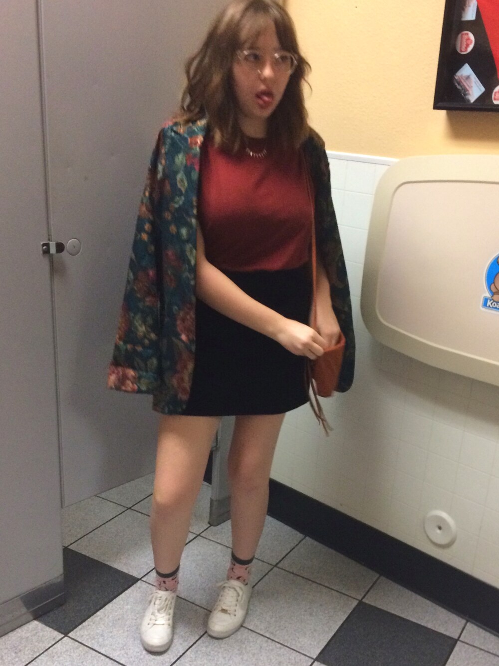 I really felt great in this outfit. I had an orange t-shirt dress is tucked into a navy A line corduroy skirt with a metallic floral blazer the sushi socks just pulled in all of the colors so well I i die!