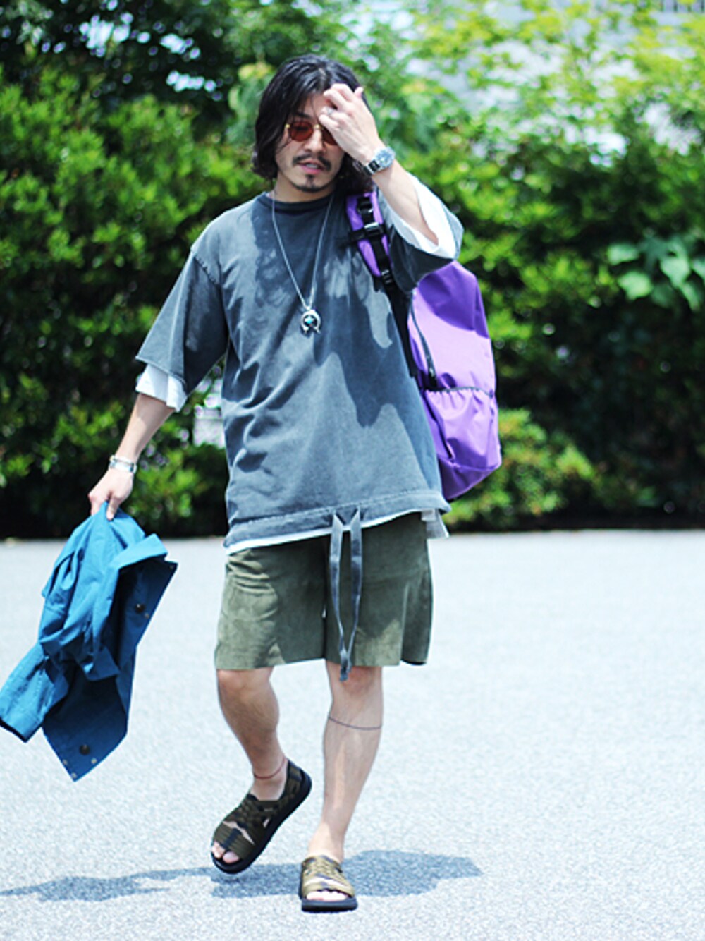 7月。 初夏に揺れる 蜃気楼。光の異常な屈折により 幻想的な影を映す。 ジミヘンドリックスの 代表曲 ”パープルヘイズ(紫のけむり)” あのイントロを初めて聴いたときにも感じた、吸い込まれるような感覚と なぜか リンクしてしまうのは 自分だけだろうか。 今回は、そんな ”パープルヘイズ” というワードから 連想した 幻想的で、魅惑的な”イロ”をベースに スタイリング。 全体的に 薄暗い配色で 組み合わせながら、キーカラーとなるパープル、 そして、くすんだ スカイブルーを 加えて、その”イロ”をつくる。 トップスは オーバーサイズのカットソーを 露骨にレイヤード、 ボトムには モスグリーンのスエード素材のショーツを合わせることで シンプルながらも ひと癖ある 独特な表情に仕上がる。 -- Purple Haze ! --