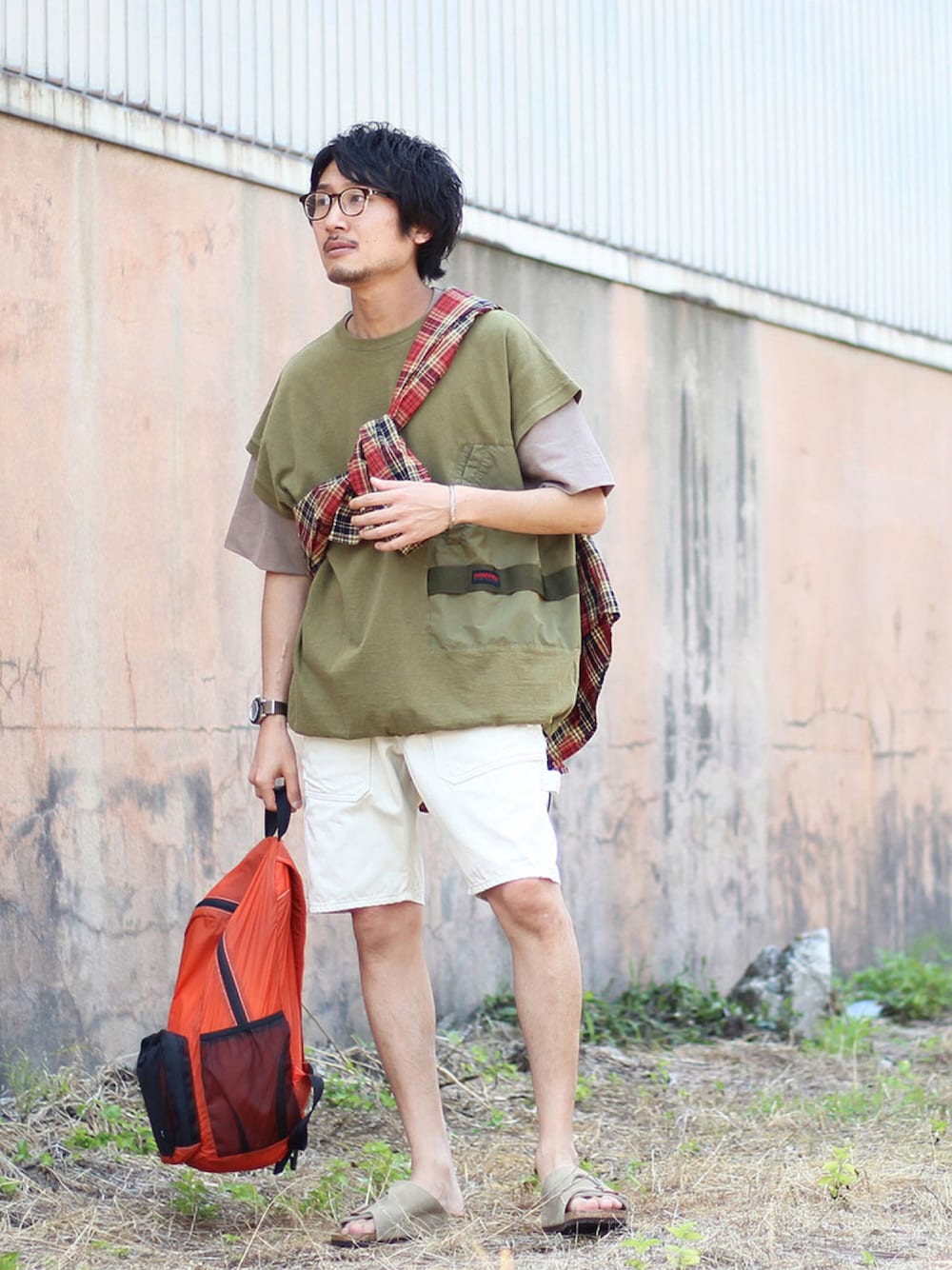 今回は、アースカラーをメインに使い落ち着いた印象にまとめたスタイルに! REMI RELIEF×BRIEFINGのノースリーブカットソーとalvanaの無地T、シンプルな アイテム同士のレイヤードは色馴染みも良く、スタイルのメインのアイテムに! パンツやサンダルもアースカラーでまとめて、統一感のある仕上がりに! シャツやバッグでカラーアイテムを使いポイントに、ナチュラルなスタイリングの アクセントにしました!