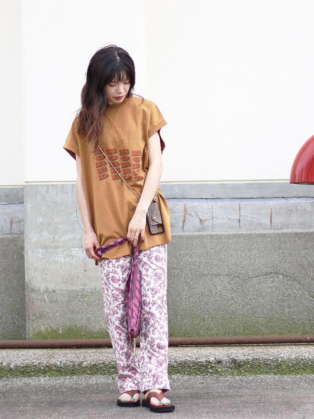 『 夏のカジュアルコーデ 』 オレンジの古着っぽいプリントTシャツに、異なる柄の パンツ・バッグ・iPhoneケースを合わせてみました! 全体を オレンジ 〜 ブラウン ~ ピンク でまとめつつ 濃淡をつけ、それぞれの柄がアクセントになるように! プリントTシャツ や 柄アイテム は 夏のコーディネートにオススメですよ!