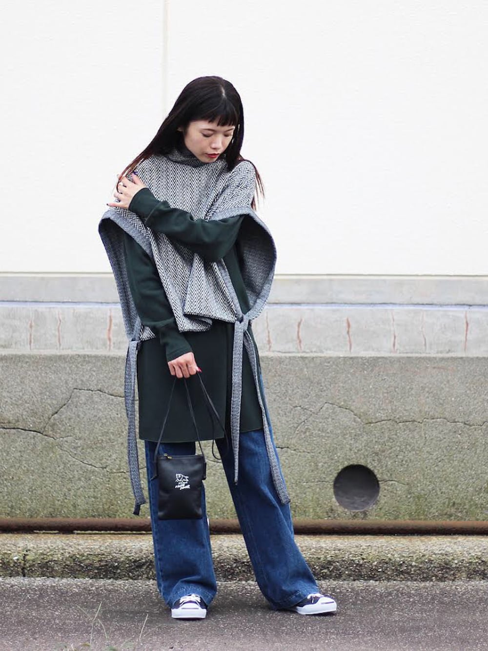 秋のレイヤードスタイル ! 主役はタートルビスチェ。プラスするだけで シンプルコーデも、こなれた印象に ! denim と スニーカー で合わせ、カジュアルに。 カジュアルながらも、モノトーン・ダークグリーンで シックな、秋らしい coordinate に !