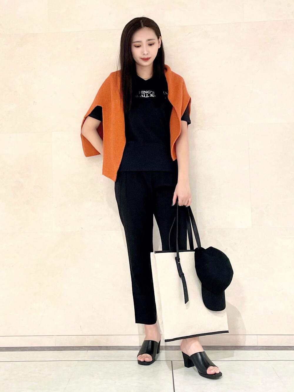 【aya_170cm_札幌大丸ラージ】 ブラック×オレンジでかっこよく!カジュアルに見えやすいロゴTも黒で統一すると大人っぽく着こなせます。パンツはウエスト総ゴムで楽ちん♪170cmの私で足首の出る着丈です。 instagram ▶︎ @indivi__offcial