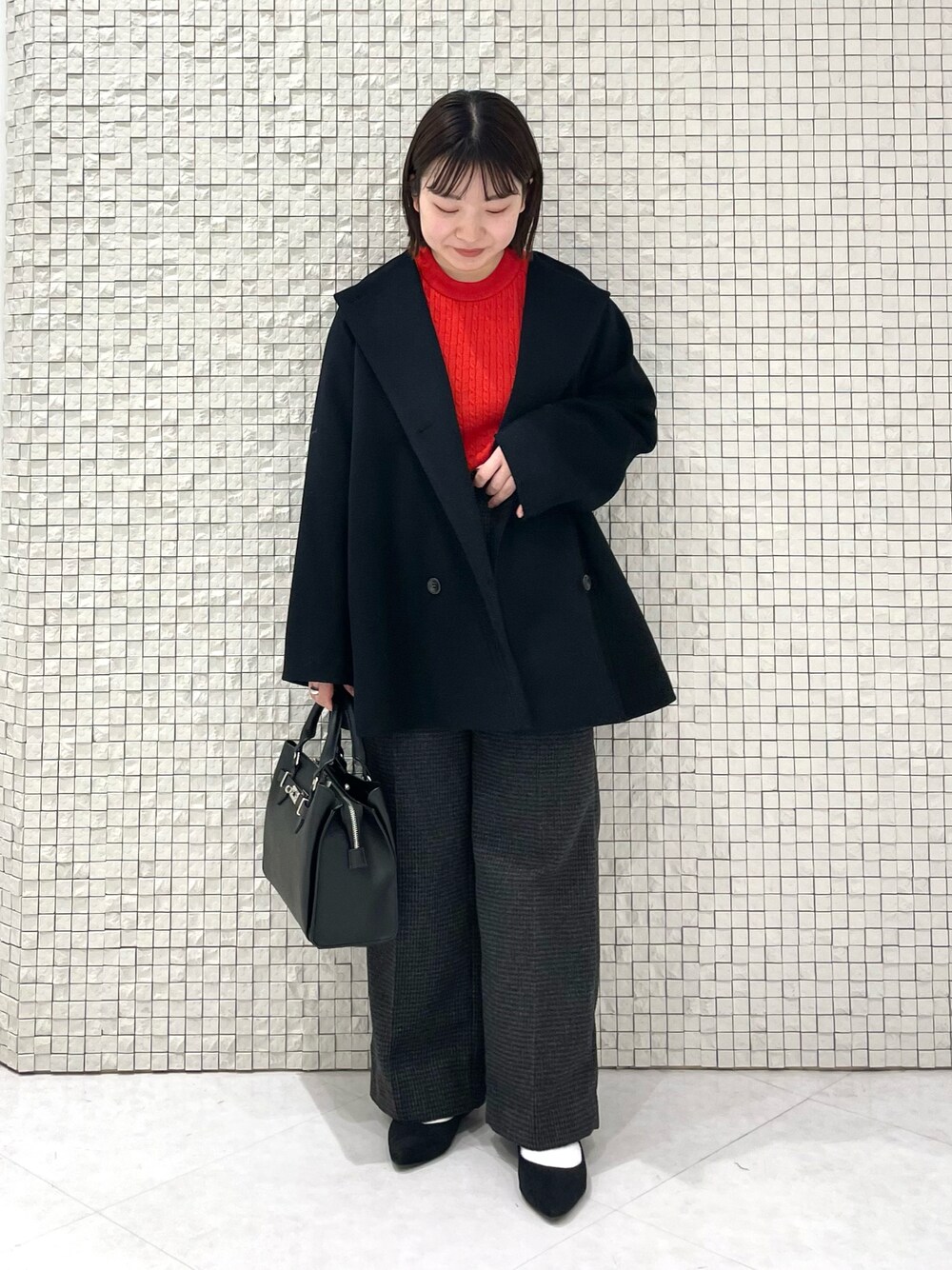 【saku_146cm_池袋東武INDIVI】 冬に着たくなる赤ニット。 パキッとしたカラーのニットは、グレー系のボトムにすると馴染みます◎ ・ニット 38着用。ぴたっとしたおつくりです。38でジャストサイズでした! ・パンツ 05着用。ウエスト、丈感ともにぴったり。太もも周りは余裕があります。 ・アウター 36着用。オーバーサイズです。厚手ニットも着込めます◎ Instagram ▶︎ @indivi__official