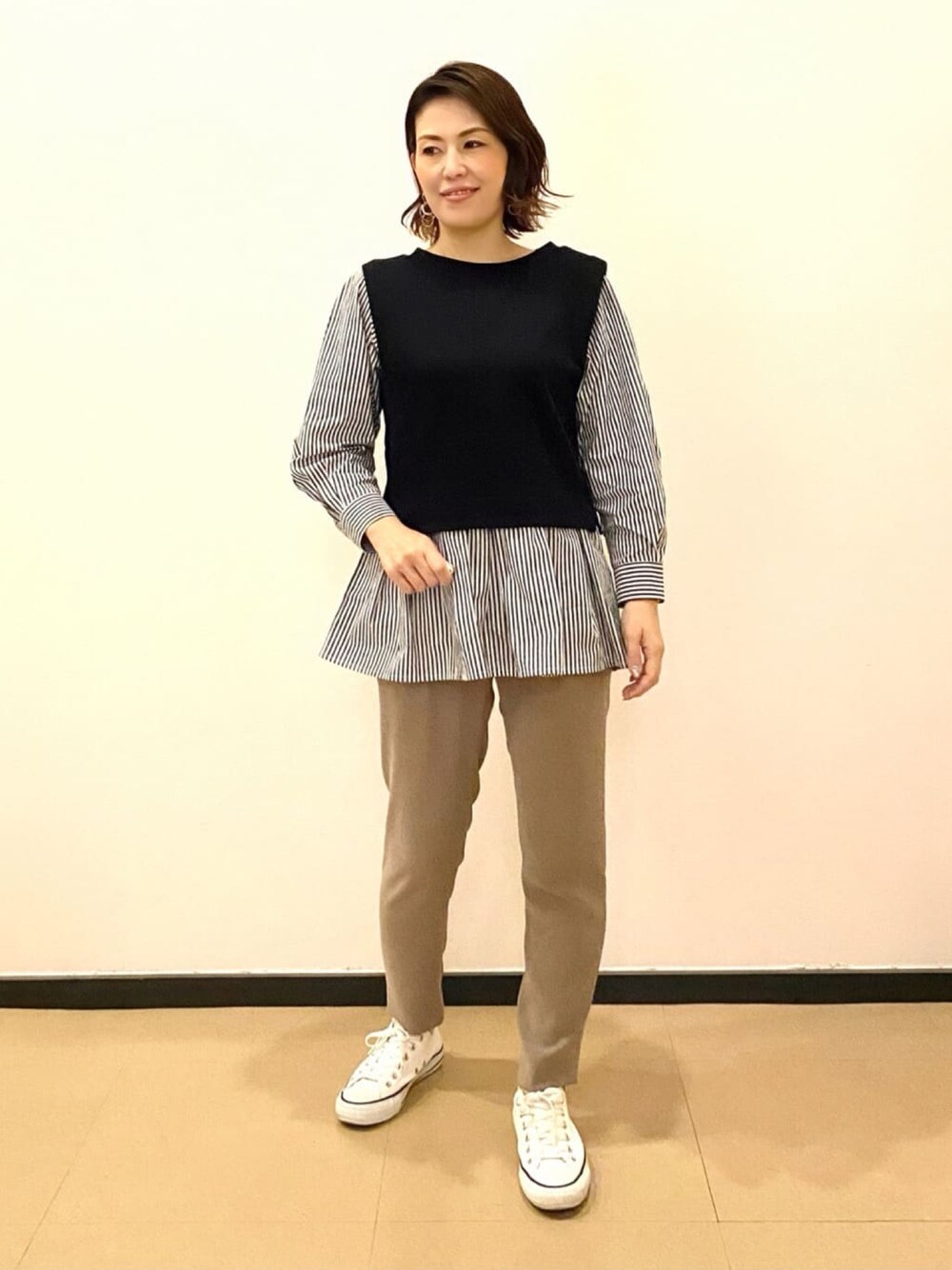 【eri_160cm_奈良近鉄】 レイヤード風のトップスは着るだけでコーディネートが決まる優れもの!!ベストの着丈が短めなのでウエスト位置が高く見えてスタイルアップが叶いますよ♪ Instagram ▶︎ @indivi.official