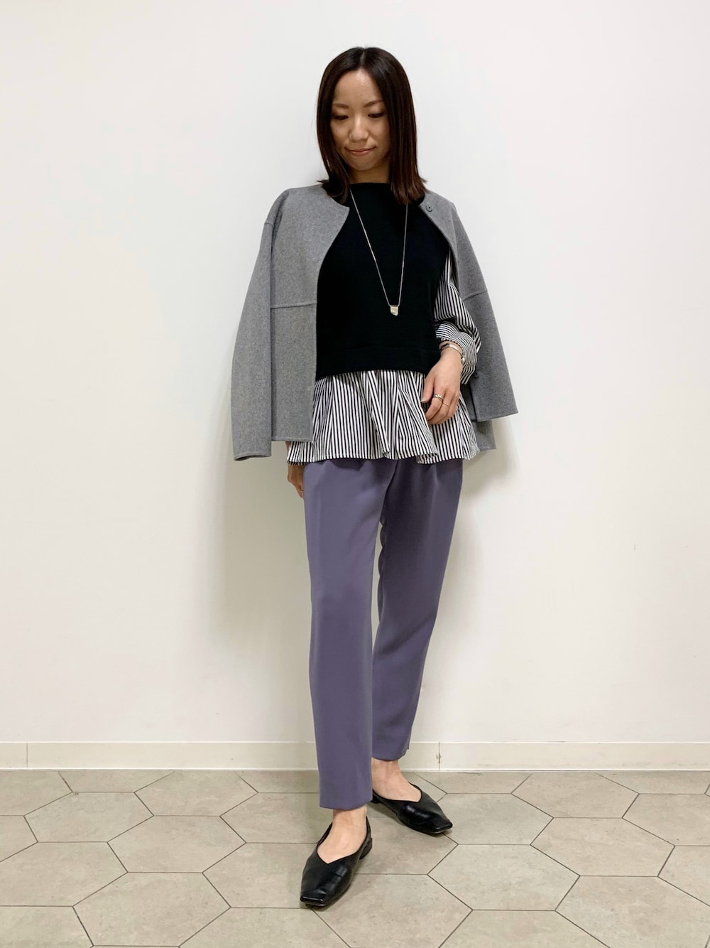 yurina(INDIVI OFFICIAL)のノーカラーコート「◆【otonaMUSE 1月号掲載商品/ハミルトンウール】リバーノーカラーショートコート」を使ったコーディネート