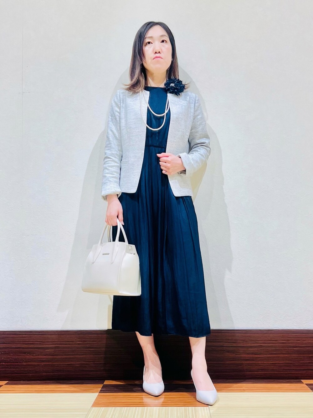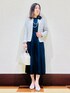 【yuu_161㎝_水戸京成百貨店】 1枚で女性らしい着こなしができるフェミニンなワンピースに、上品なツィードのジャケットを合わせたセレモニースタイルです。ジャケット丈が短めなのでワンピースと相性◎セットアップのパンツやスカートともバランス良く着こなせます。 Instagram▶︎@indivi.official