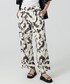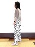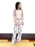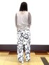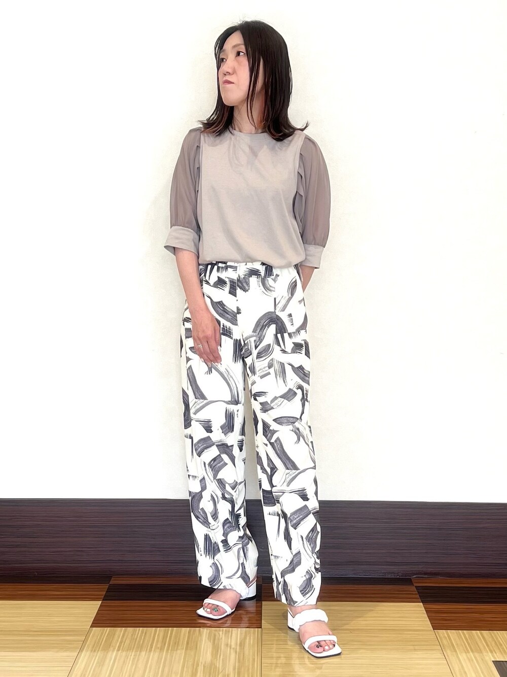 パンツが目を惹く柄なので、トップスはシンプルで控えめなカラーにしました。 上品でフェミニンなトップスが、インパクトあるパンツと合わせると、トレンド感のあるスタイリングになります。
