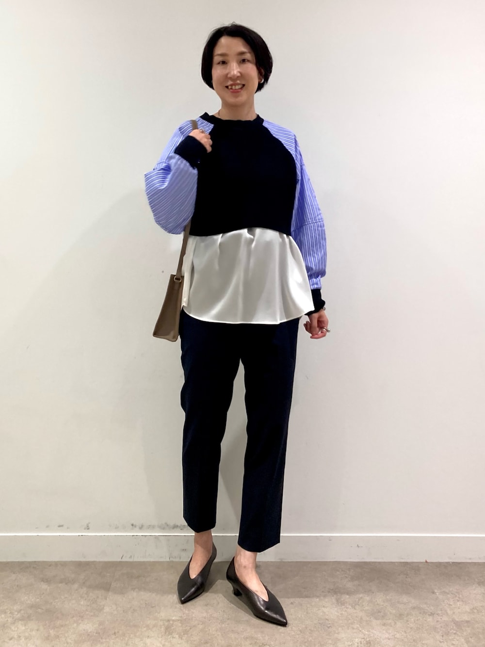 【yuri_170cm_立川伊勢丹】 ボレロ羽織デザインでレイヤードスタイリング! 前後でトップスとしても、ボレロ羽織としても着用可能♪ 袖がパフンとハリ感ある膨らみのデザインに。170センチ38サイズですが袖丈少し長めです。 着丈胸下あたり。ボタンを後ろ合わせで着用してます。 レイヤードでも活躍するシンプルなブラウスは程よい光沢感なのでオンオフ問わず合わせられます。柔らかさ軽さ抜群!着丈もヒップかかる長さ。サイドスリットもあるので重くなりません。 スタイルアップ効果のある、定番の褒められパンツシリーズのテーパードパンツは、股上やや深めです。 とても軽く柔らかくて着心地◎ ヒップから膝まで全体的に少しゆとりがあり窮屈感なくストレスフリーです。 170センチ38サイズ着用。ヒップ周りフィットあり。くるぶしより上の着丈になりす。 こちらのパンツ(ブラウンカラー)で38サイズ、40サイズ着比べてますのでご参考にして頂ければ嬉しいです♪ Instagram ▶︎ @indivi__official