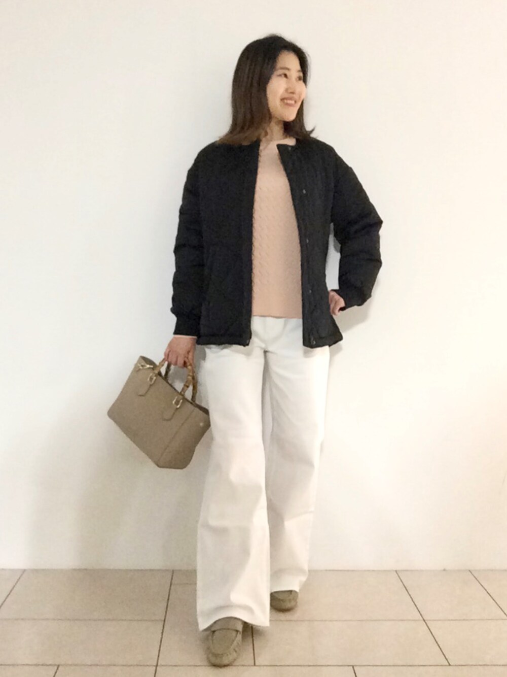 【tsuttyi_156cm_近鉄草津店INDIVI】 キルティングコートで、春のお出掛けコーディネート♪ コートはトレンドのキルティングデザイン!腰回りをカバーでき、中にしっかり着込めるゆとり感があります。袖にリブがついており、防寒対策もバッチリです◎ 織りが可愛いニットは、細身過ぎないコンパクトさがパンツでもスカートでも合わせやすいデザインです。肌馴染みの良いカラーなので、挑戦しやすくオススメです! 白のパンツはセミワイドのストレートラインで、ややサイズ感大きめ。白パンで一気に春らしくなりますね! インナーが淡いカラーなので、あえて黒のコートで引き締めてみました! Instagram ▶︎ @indivi__official