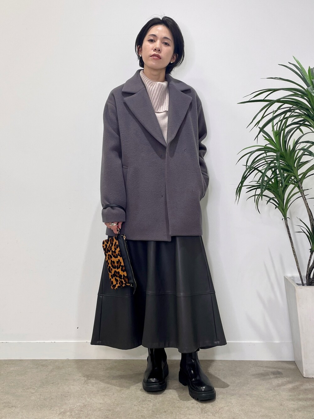 シックなチャコールカラーでまとめた 綺麗めモードなスカートスタイルです◎ 重たくなりすぎないよう、 インナーには一見ピンクベージュの優しいラベンダーMixカラーをピックアップ◯ 顔まわりは明るく演出してくれます。 コートは衿つきの綺麗めでカジュアルすぎない印象にしてくれます。 合皮のフレアスカートもチャコールカラーで 黒ほど強くなりすぎない、優しい印象に♪ 足元と小物は辛口のものでモードなスタイルにしました。 オフィシャルサイトのムービーで詳細をご紹介していますので ぜひそちらも合わせてご参考くださいませ。