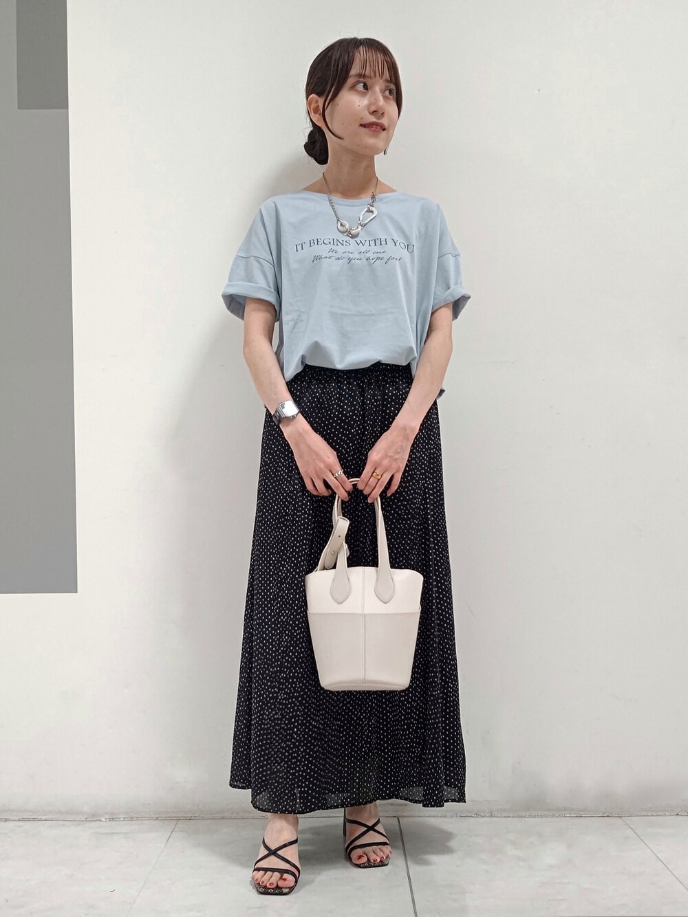【ito_148cm_星ヶ丘三越INDIVI】 夏のスカートスタイル♪ スカートははき心地が軽く、黒色でも重くならずにお召しいただけます! 華奢なロゴが大人っぽいTシャツは、コットン100%で涼しく着心地が良いです! 肩が少し落ち、お袖に程よく長さがでます!(写真は袖先を2折りしております。) くすみがかったブルーのお色ですので、ナチュラルに色物を取り入れたい方にオススメです♪ Instagram : @indivi__official 新作情報などお得な配信をしておりますので、是非チェックしてください!