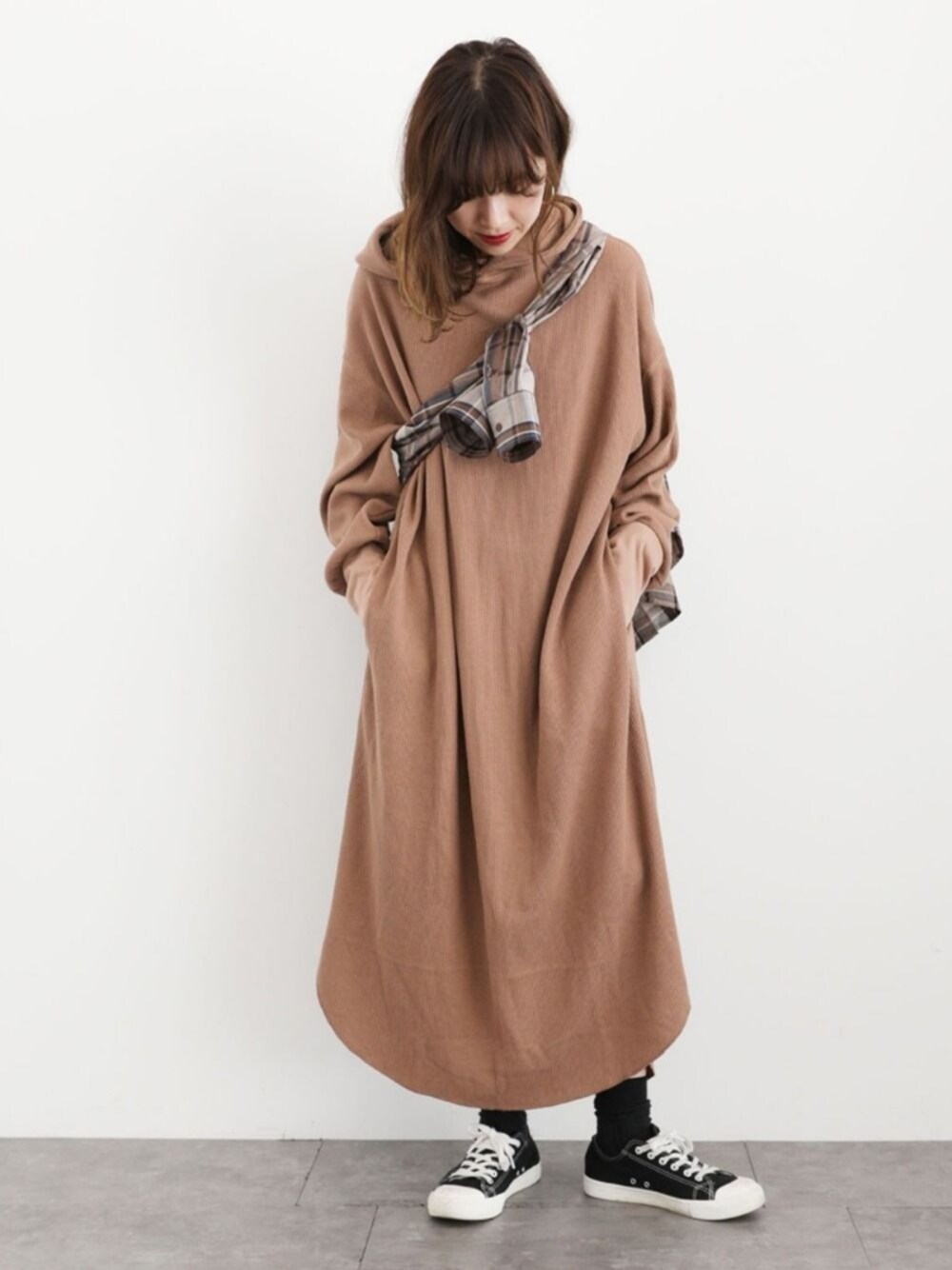 i n eのワンピース「ワッフルサーマルロングパーカーワンピース ★〇」を使ったコーディネート