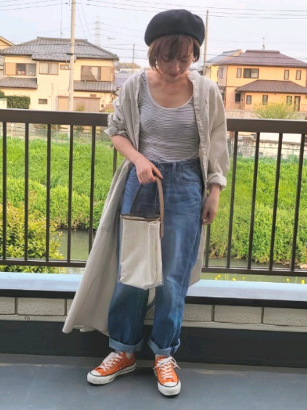 シャツワンピをさらっと羽織って!! オレンジのコンバースが差し色で◎