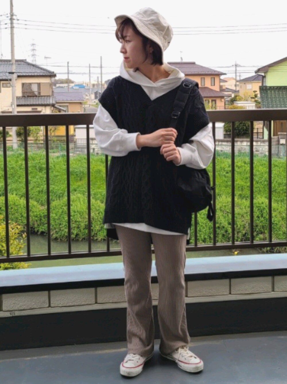 パーカーをニットベストと合わせて◎ トップスがゆるっとしてるのでボトムはすっきりめに!! この全体バランスわたし好みです◎
