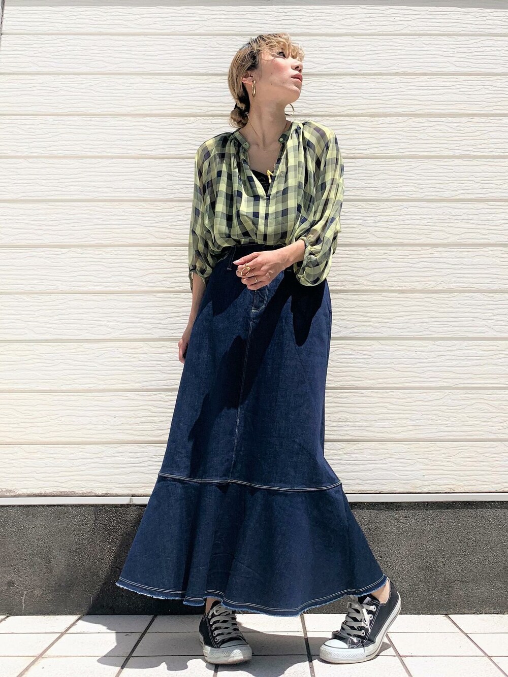 定番のデニムスカートにカラーチェックのブラウスを合わせて