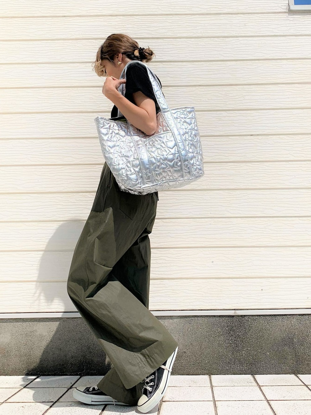 casseliniのスターキルティングトートを主役に、ラフなコーディネートに仕上げました。